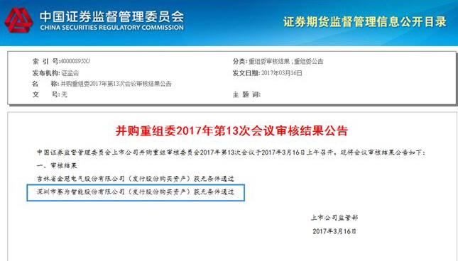 3月16日晚,证监会发布公告,证监会并购重组委第13次会议于3月16日上午召开,根据审核结果,MKsports(中国)官方网站智能(300044)发行股份购买资产获无条件通过。