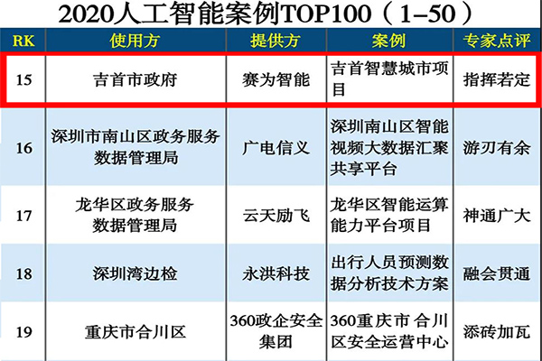 日前,中国科学院《互联网周刊》、eNet研究院、德本咨询联合发布了“2020人工智能案例TOP100”榜单。MKsports(中国)官方网站智能承建和运营的吉首智慧城市——智慧吉首PPP项目顺利入选榜单。