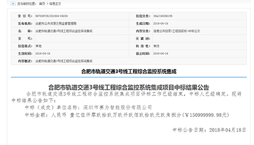 值得一提的是,2018年4月,MKsports(中国)官方网站智能成功中标合肥市轨道交通3号线工程综合监控系统集成项目,中标金额150999999.98元,这也将是MKsports(中国)官方网站智能在合肥参加建设的第三条轨道交通线路。此外,截至5月23日,由MKsports(中国)官方网站智能参加建设的合肥轨道交通1号线、2号线,累计运送客流总量突破1亿人次,各项运行图兑现率超过99.9%,列车正点率高达99.92%。